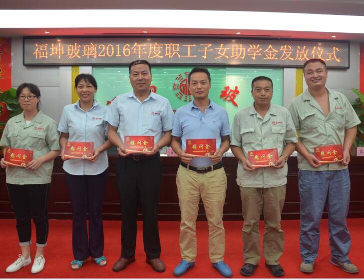 8月27日,江苏福坤玻璃2016年度职工子女助学金发放仪式在我司西厂五楼会议室进行,董事长、总经理洪爱萍为叶祝建、吕燕、周忠明、张云凤、殷建农、徐霞等6名员工发放第三批“员工子女助学金”,并代表公司全体同仁祝贺他们的子女如愿考进理想的大学和高中. 通过成立“员工子女助学金”,给学习成绩优异的员工子女一定的奖励,增加了员工的责任感和归属感。许多员工表示,这一人性化的福利措施让他们倍感温暖,倍觉荣幸,他们表示将进一步做好本职工作,为企业多做贡献。 | |