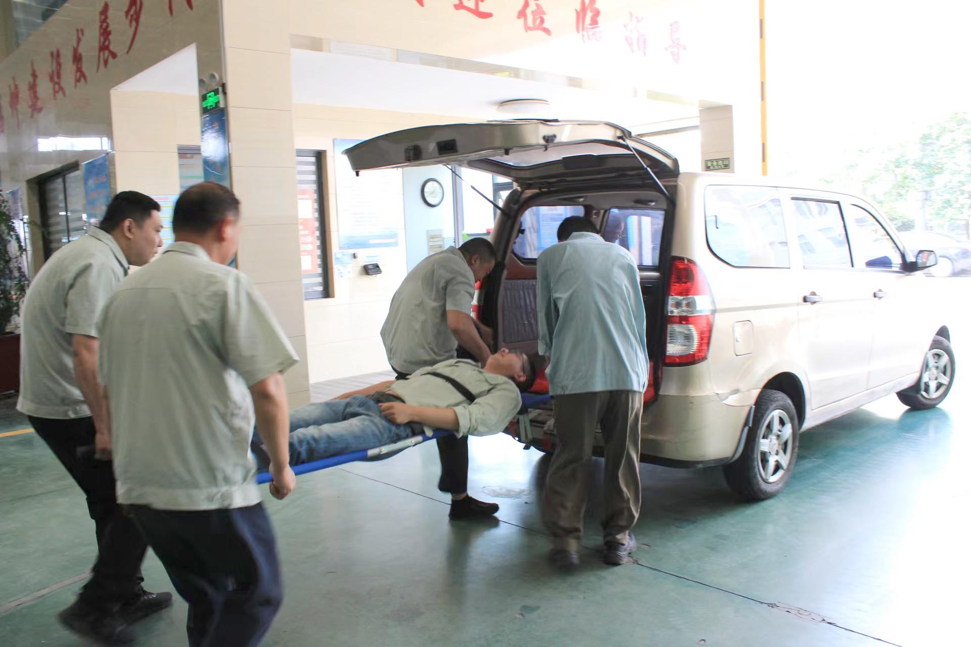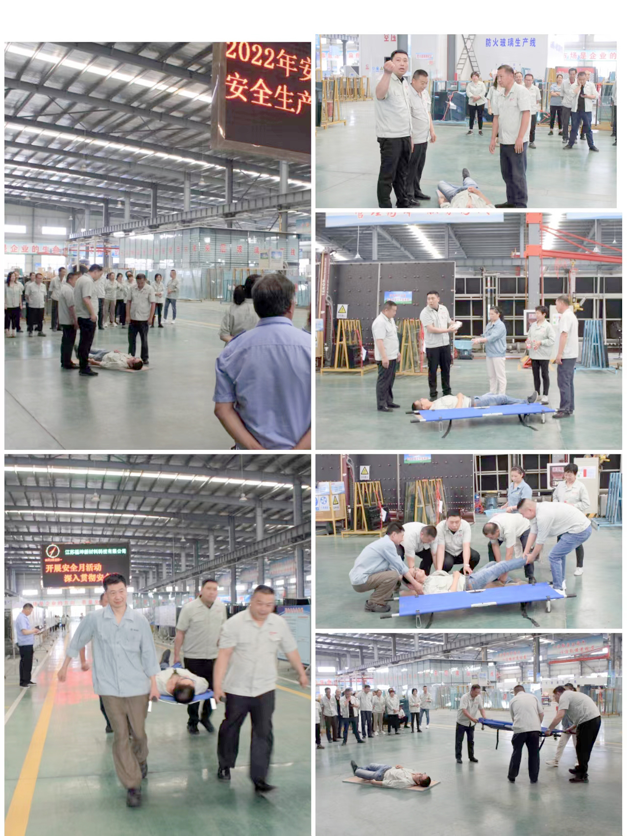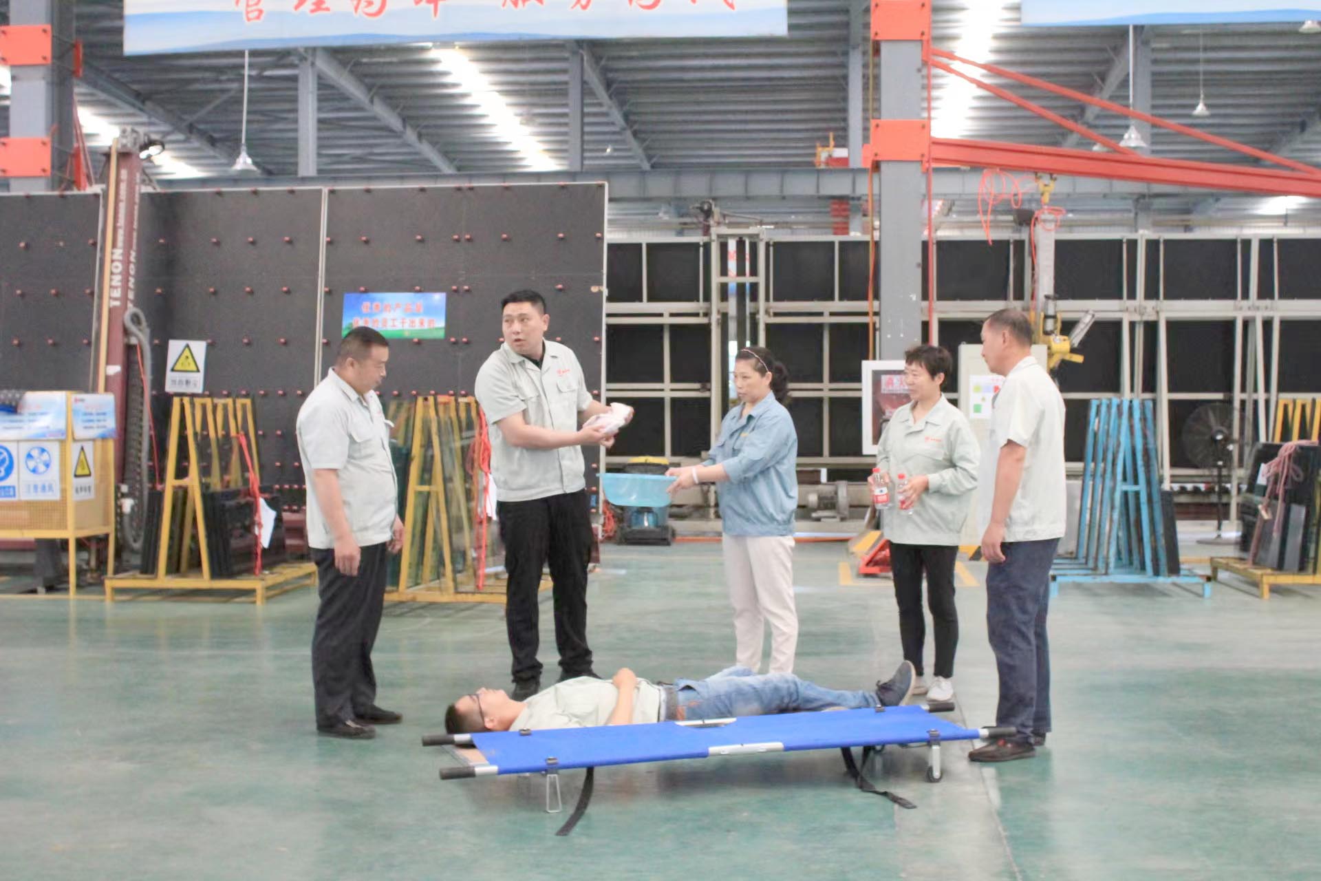 按照演练习预案,模拟夹胶班组一名员工突然中暑晕倒在地,班组员工发现情况后逐级上报,迅速将人员抬至阴凉处展开急救处理,敞开上衣,领取急救物品及担架,用冷湿毛巾、冰袋等进行降温,随后将人员固定在担架上,快速搬上急救车辆。