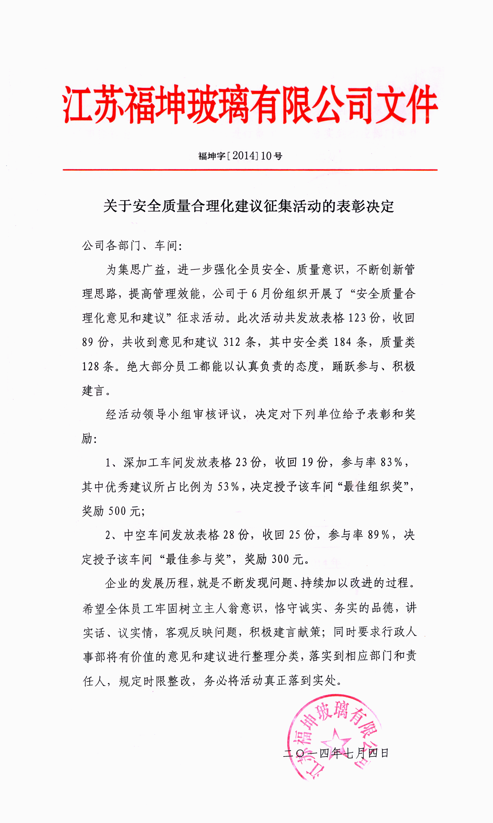 安全质量合理化建议征求活动表彰